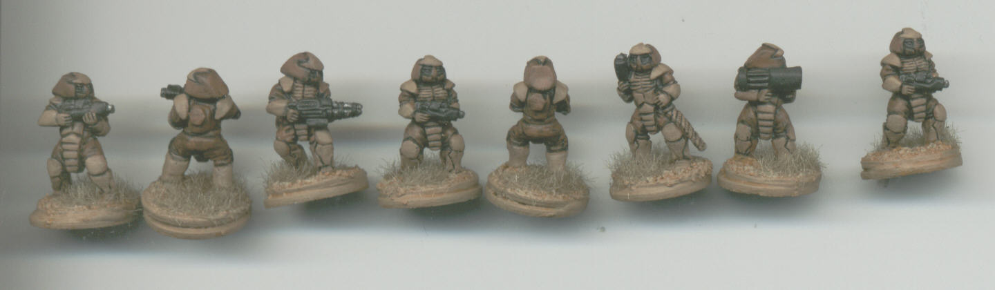 Unless otherwise stated, normal infantry packs (not power armor) come in eight figures, typically an officer, a SAW (MG), a GMS/P (rocket launcher), and five riflemen in two poses.