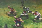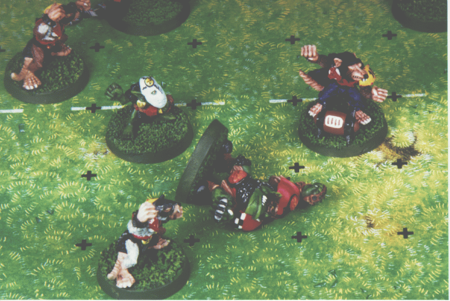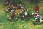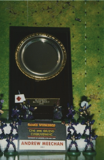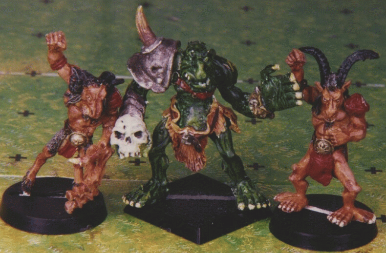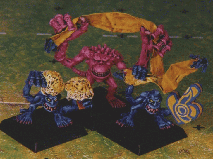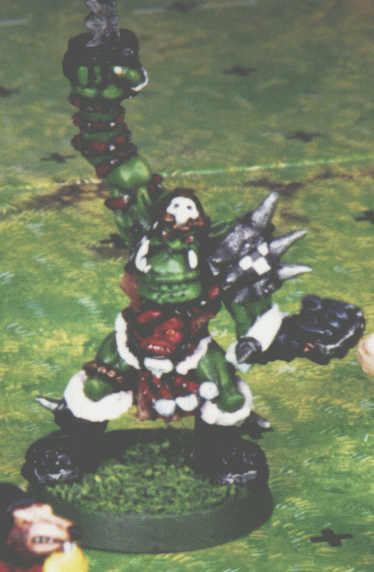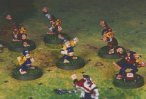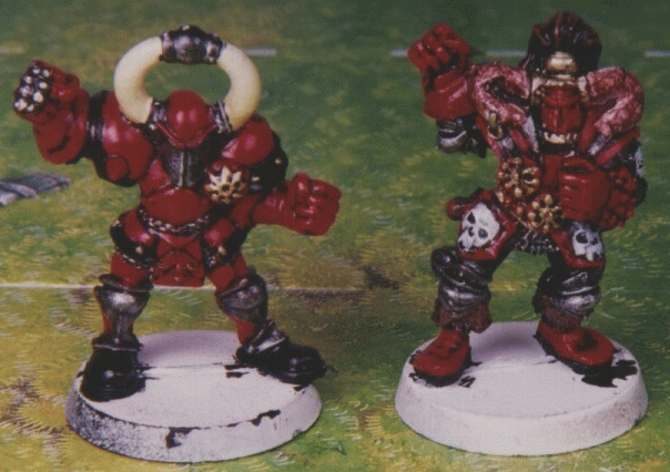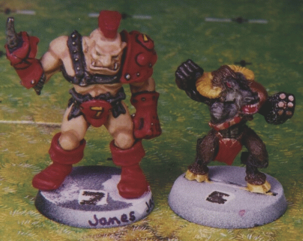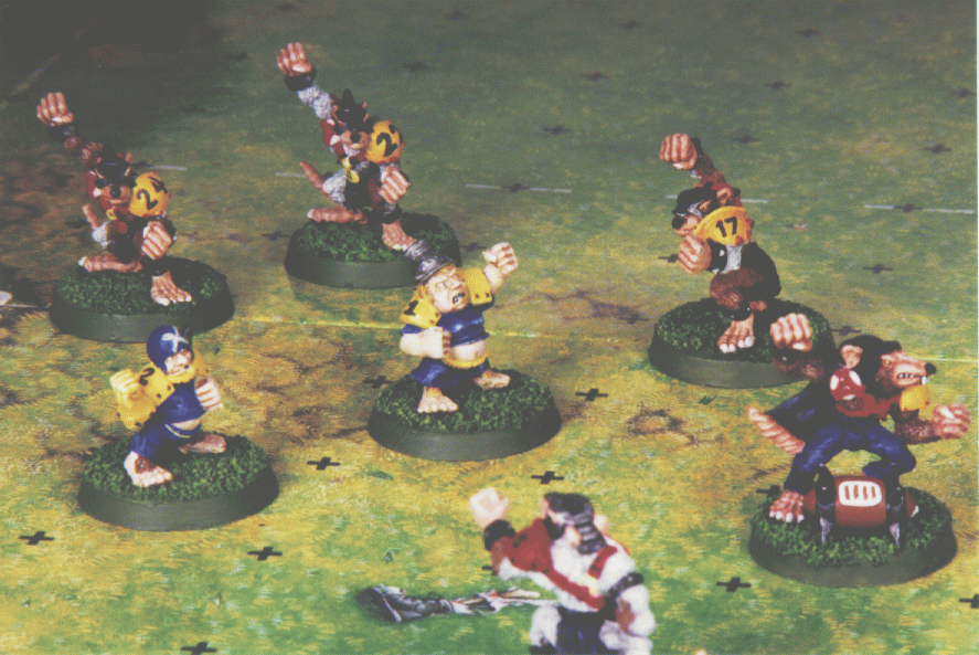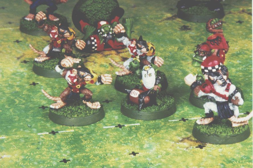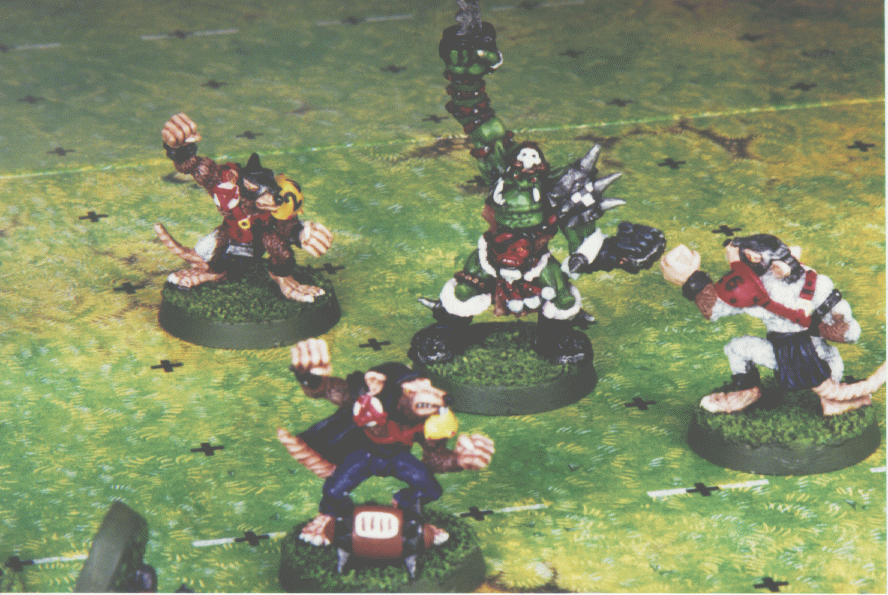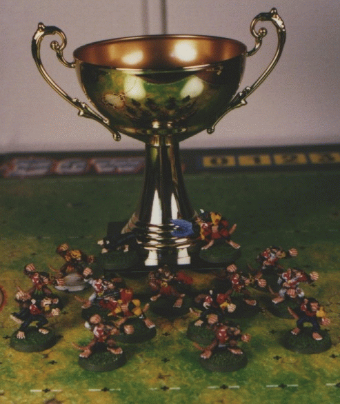 We did a similar thing on the Blood Bowl mailing list. Several of us were attending GW's Grand Tournament, so I proposed something like a legacy team; a month before, participants starting painting up Chaos minis. We assembled them and displayed them at the tournament, and had BB designer Jervis Johnson draw the winner from a hat. Everyone got their name in once for normal players and twice for big guys. It was a lot of fun, and as you can see, the miniatures were painted really well. In the end, Jervis drew Milo Sharp's name, who is now the proud owner of a new Chaos team!